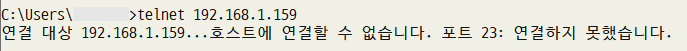port 개방여부 확인 (포트 개방시 cmd 창이 전환됨. 위 경우 연결 실패했음)